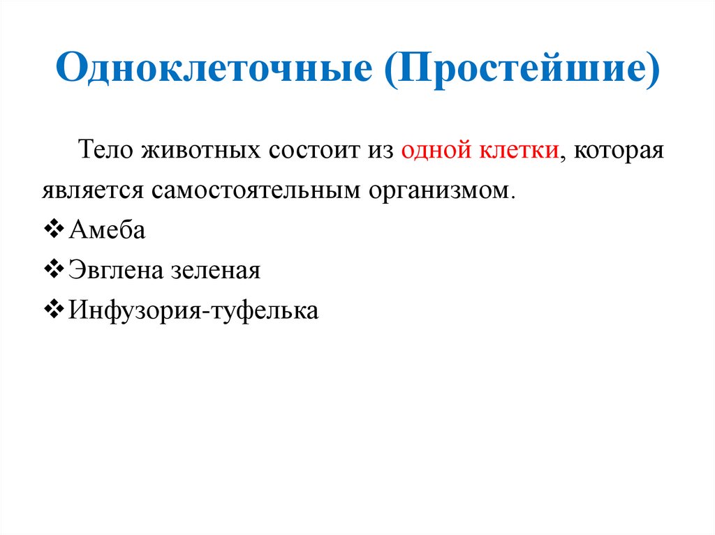 Одноклеточные (Простейшие)Тело животных состоит из одной клетки, которая