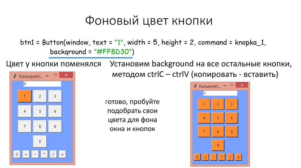 Фоновый цвет кнопкиЦвет у кнопки поменялся Установим background на все остальные кнопки,