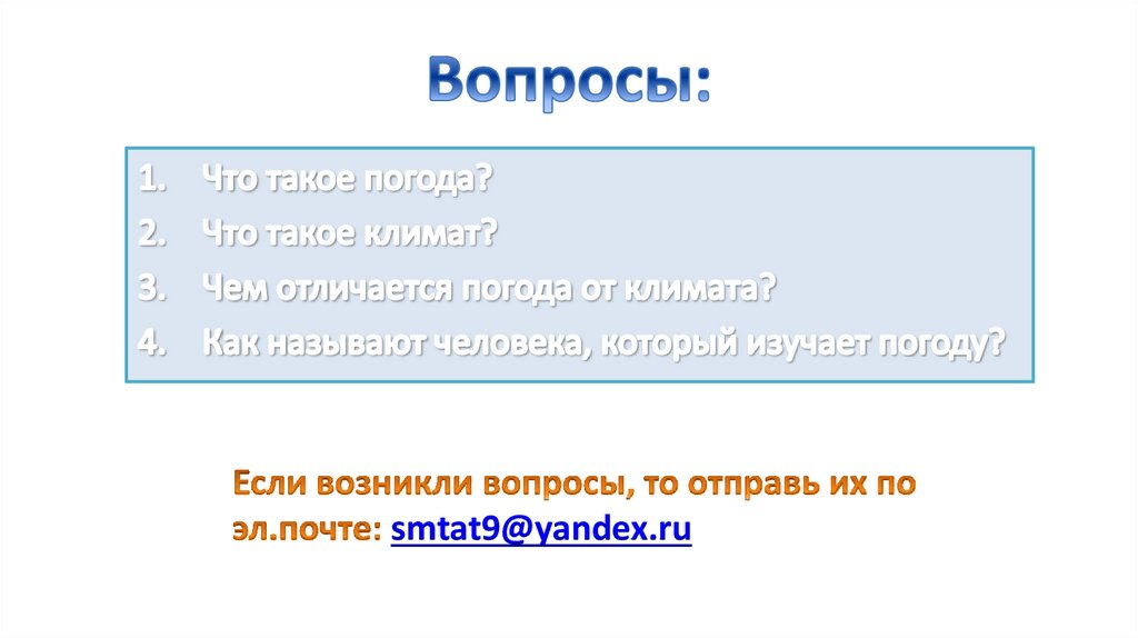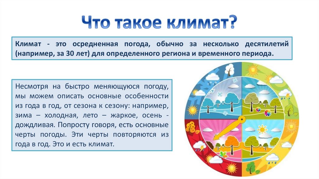 Климат - это осредненная погода, обычно за несколько десятилетий(например, за 30 лет) для определенного региона и временного периода.