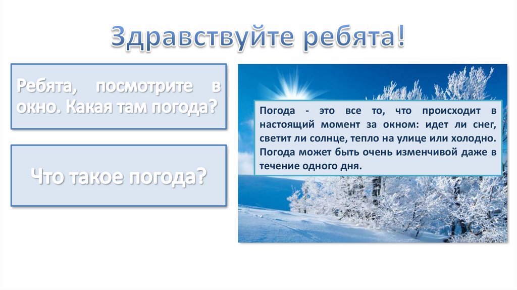 Погода - это все то, что происходит внастоящий момент за окном: идет ли снег,
