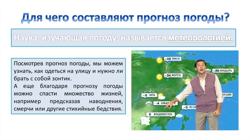 Посмотрев прогноз погоды, мы можемузнать, как одеться на улицу и нужно ли