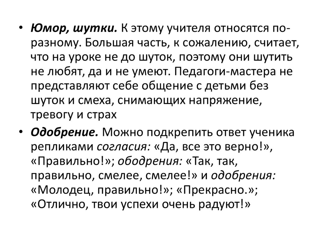 • Юмор, шутки. К этому учителя относятся поразному. Большая часть, к сожалению, считает,что на уроке не до шуток, поэтому они шутить