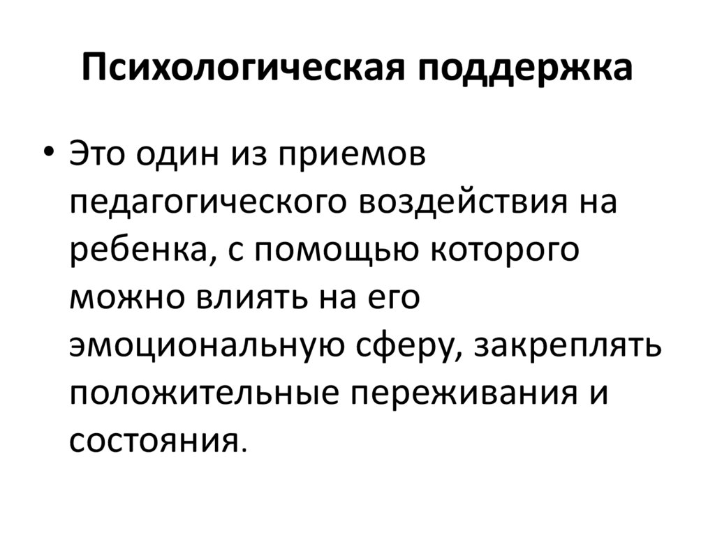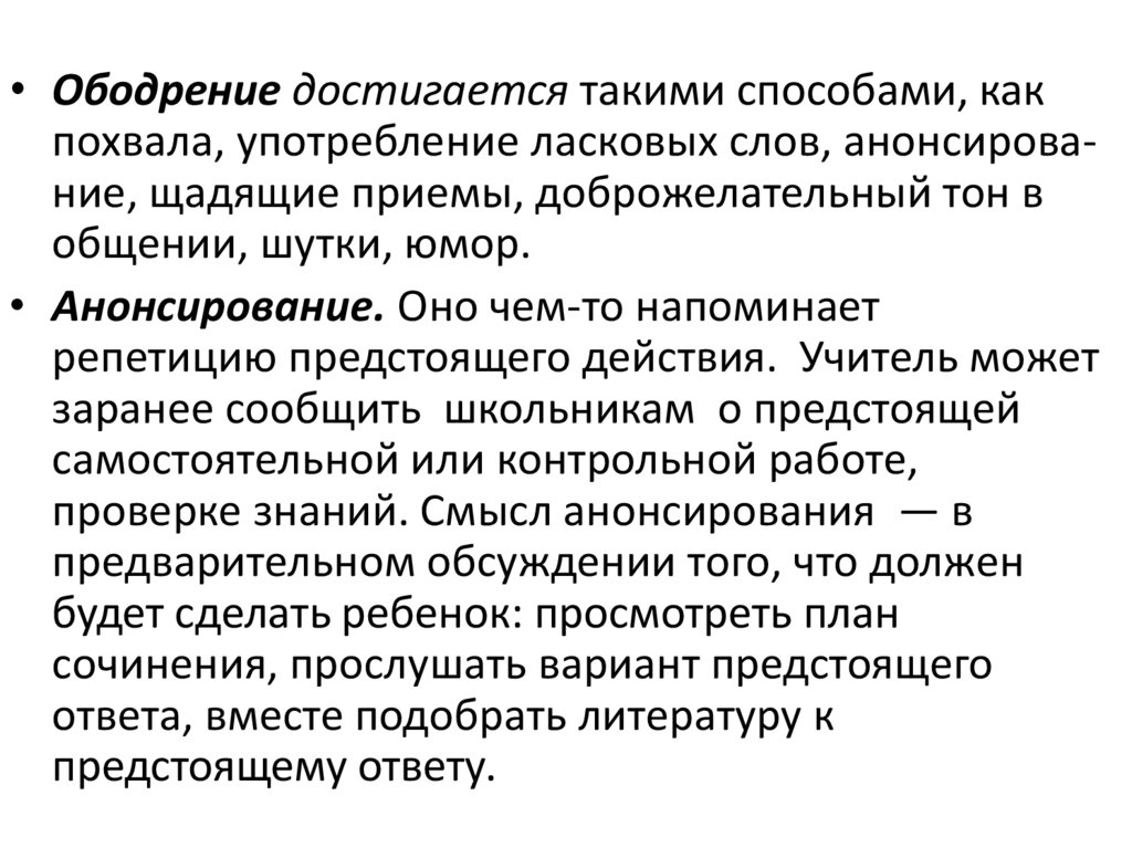 • Ободрение достигается такими способами, какпохвала, употребление ласковых слов, анонсирование, щадящие приемы, доброжелательный тон в