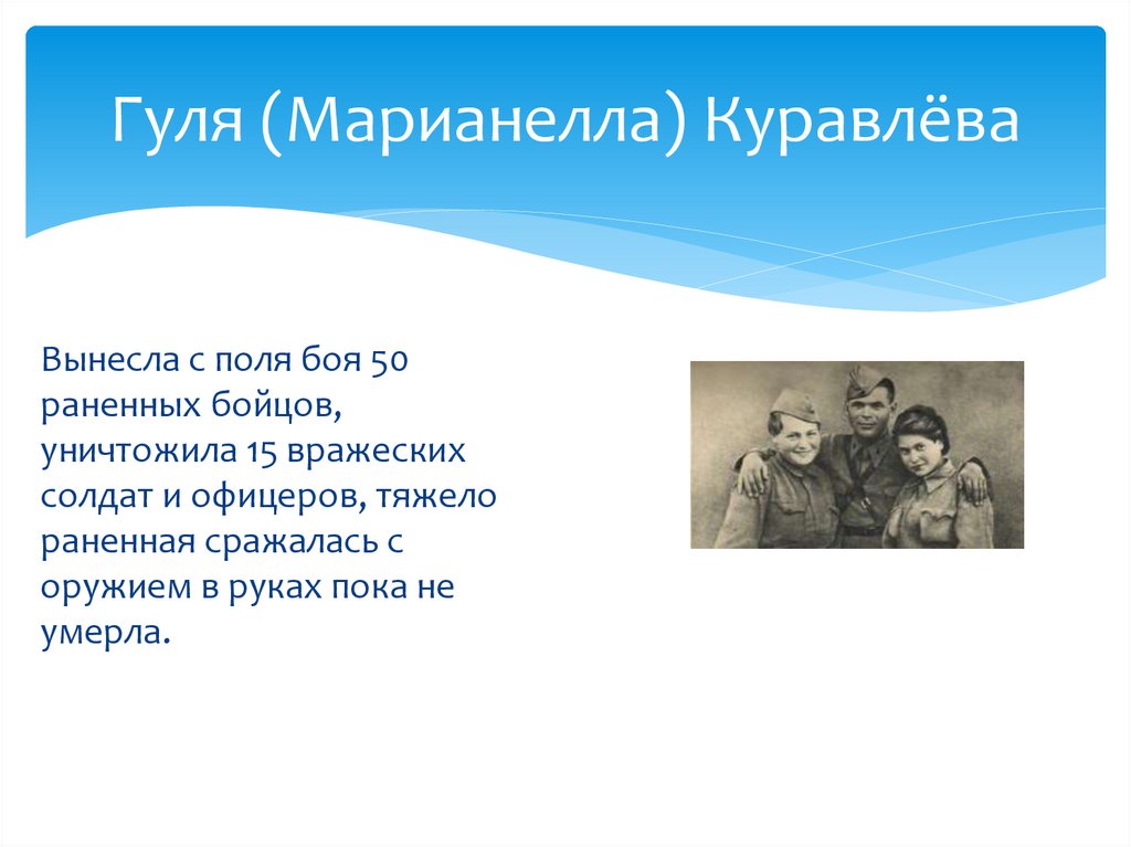 Гуля (Марианелла) КуравлёваВынесла с поля боя 50