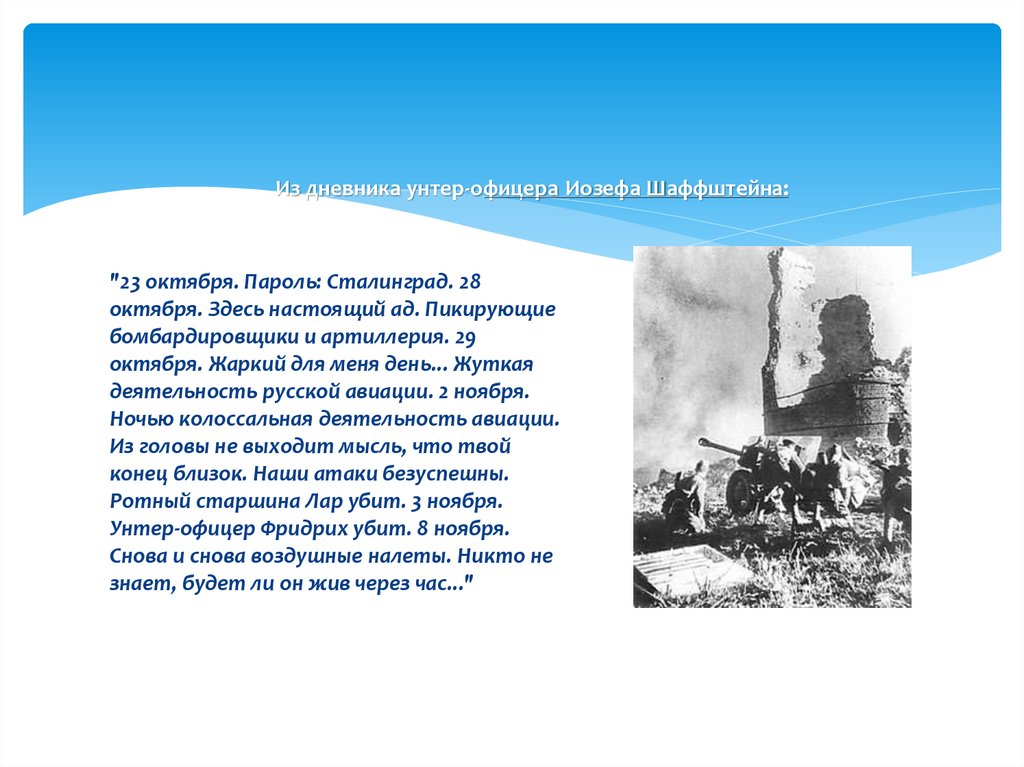 Из дневника унтер-офицера Иозефа Шаффштейна:"23 октября. Пароль: Сталинград. 28