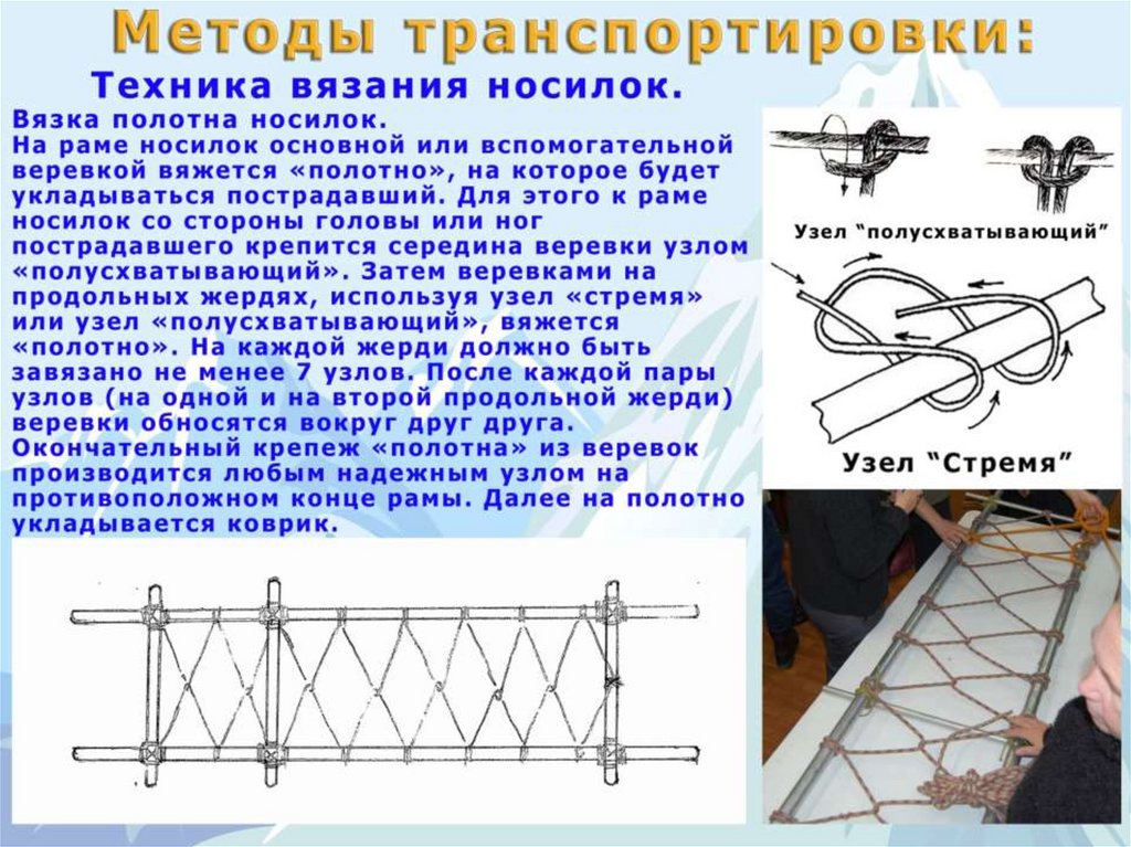 Способы транспортировки пострадавшего. Изготовление носилок из подручных средств