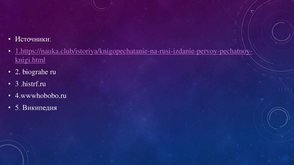 • Источники:• 1.https://nauka.club/istoriya/knigopechatanie-na-rusi-izdanie-pervoy-pechatnoyknigi.html
