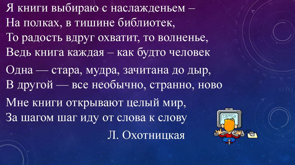 Я книги выбираю с наслажденьем –На полках, в тишине библиотек,