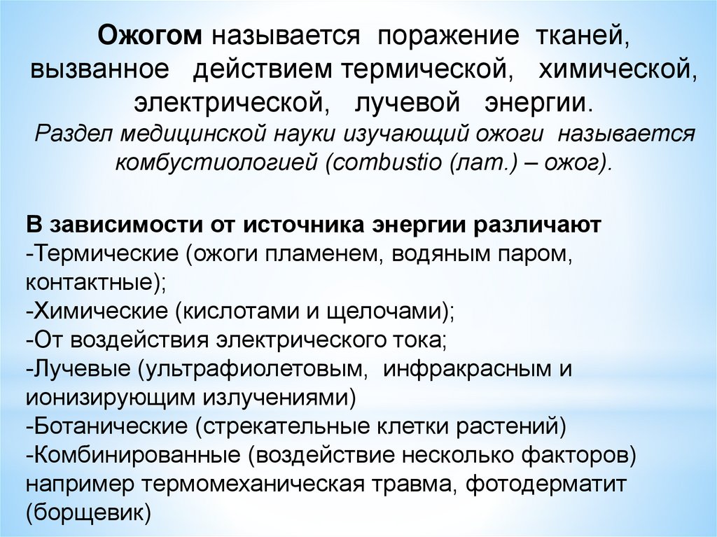 Ожогом называется поражение тканей,вызванное действием термической, химической,