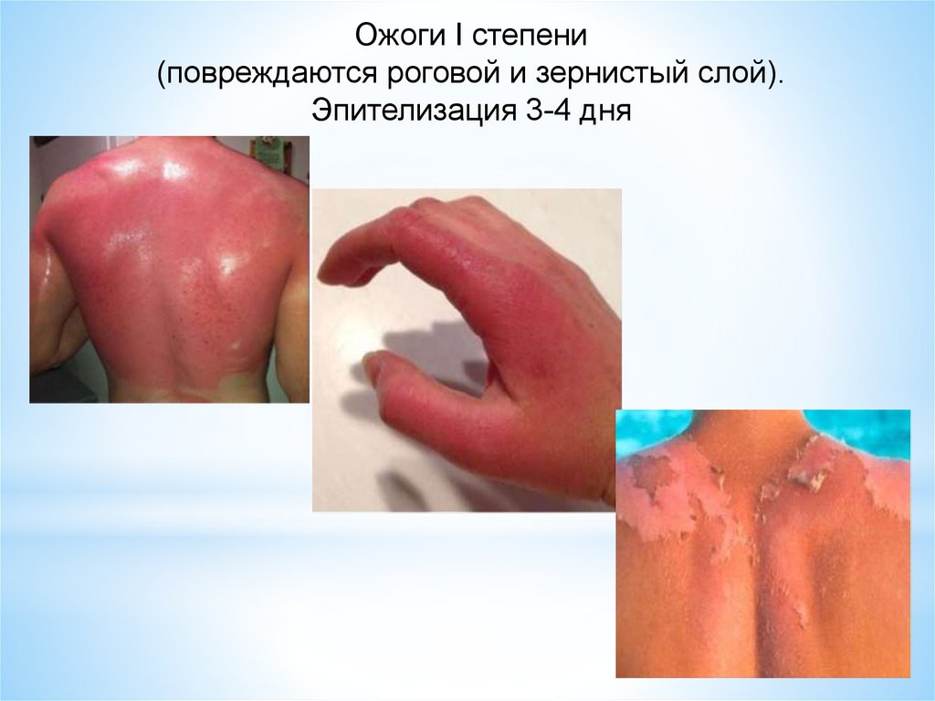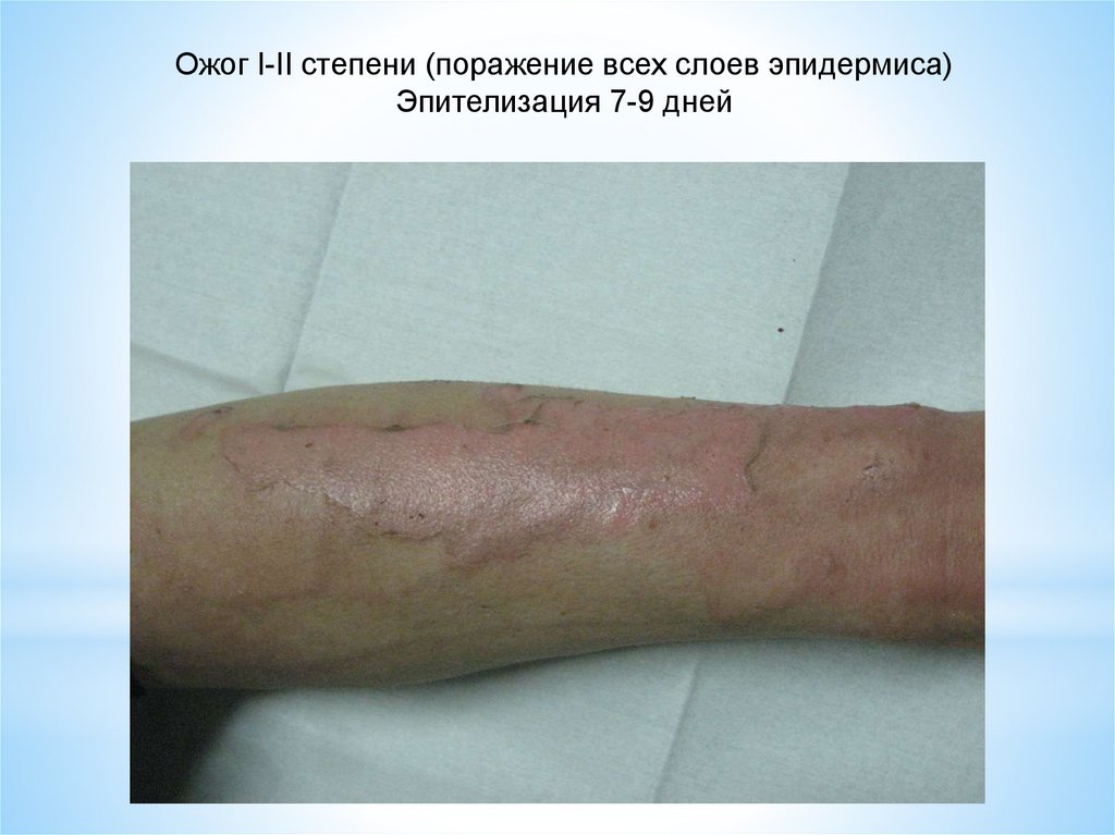 Ожог I-II степени (поражение всех слоев эпидермиса)Эпителизация 7-9 дней