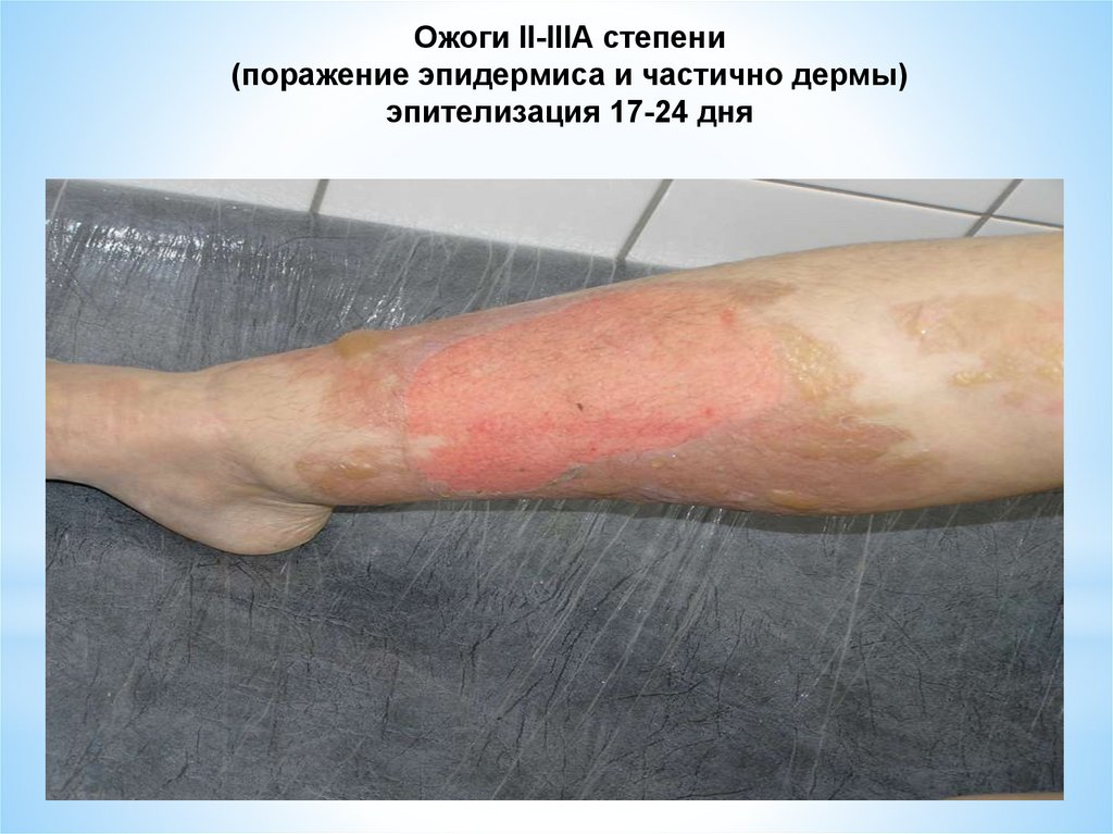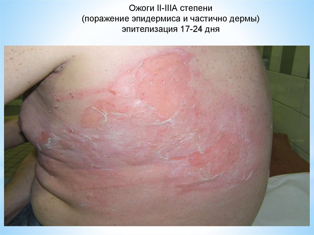 Ожоги II-IIIА степени(поражение эпидермиса и частично дермы)
