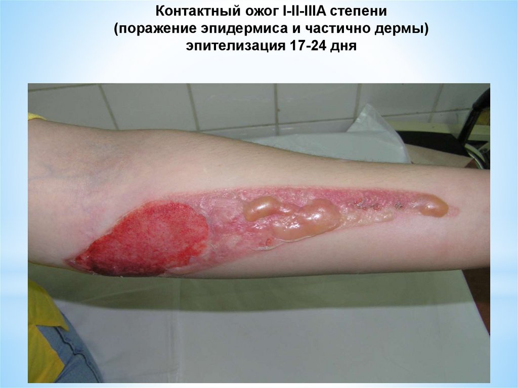 Контактный ожог I-II-IIIA степени(поражение эпидермиса и частично дермы)