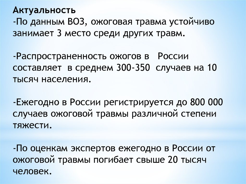 Актуальность-По данным ВОЗ, ожоговая травма устойчиво