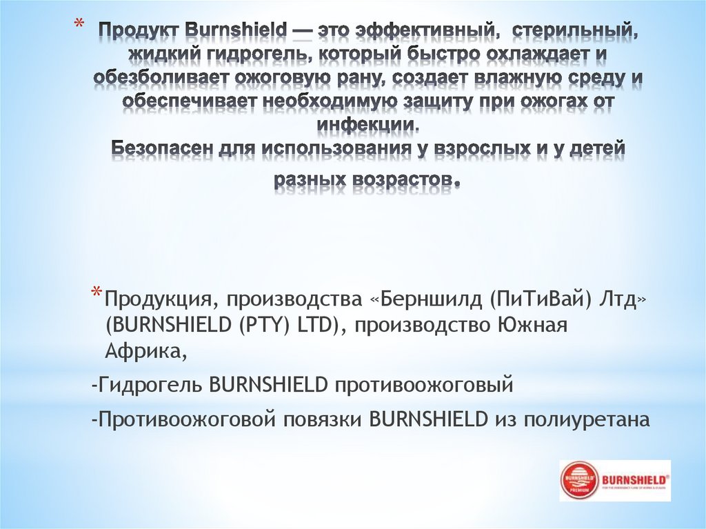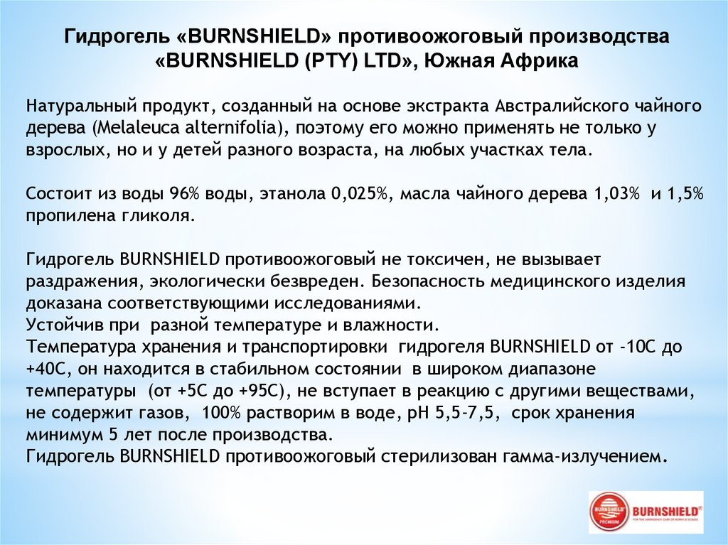 - Наличие в гидрогеле «BURNSHIELD» экстракта Австралийского