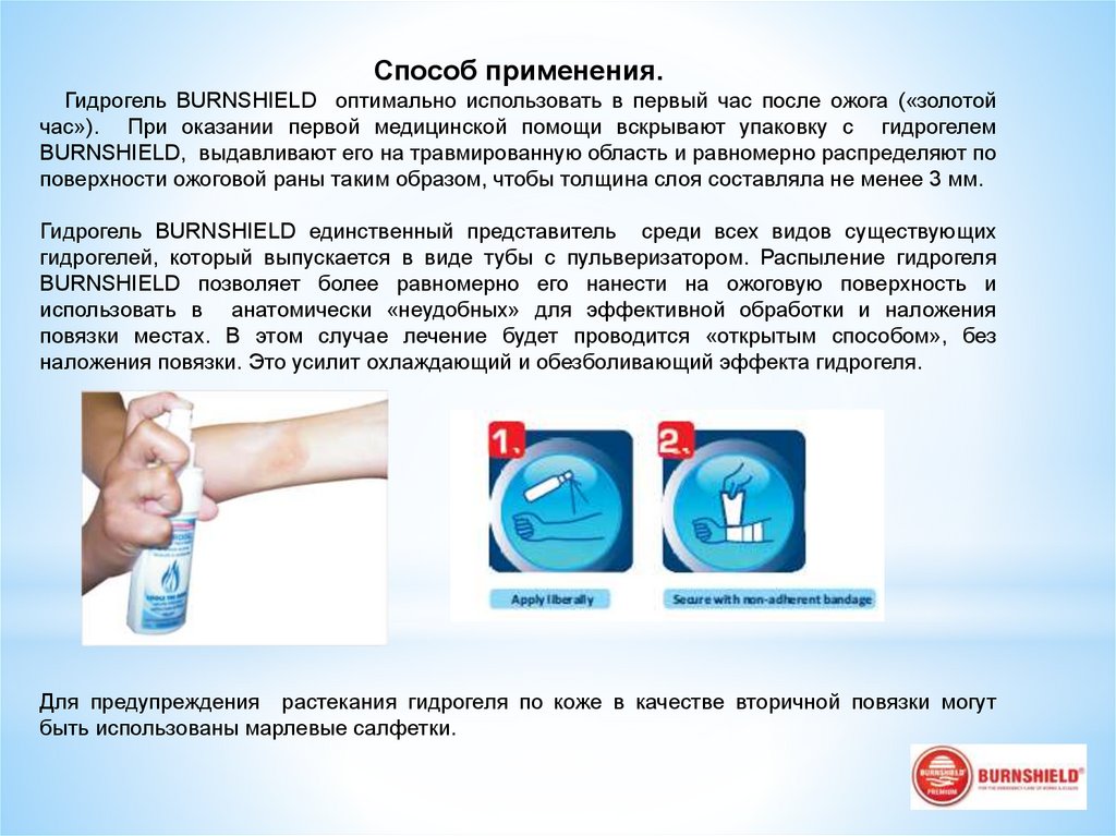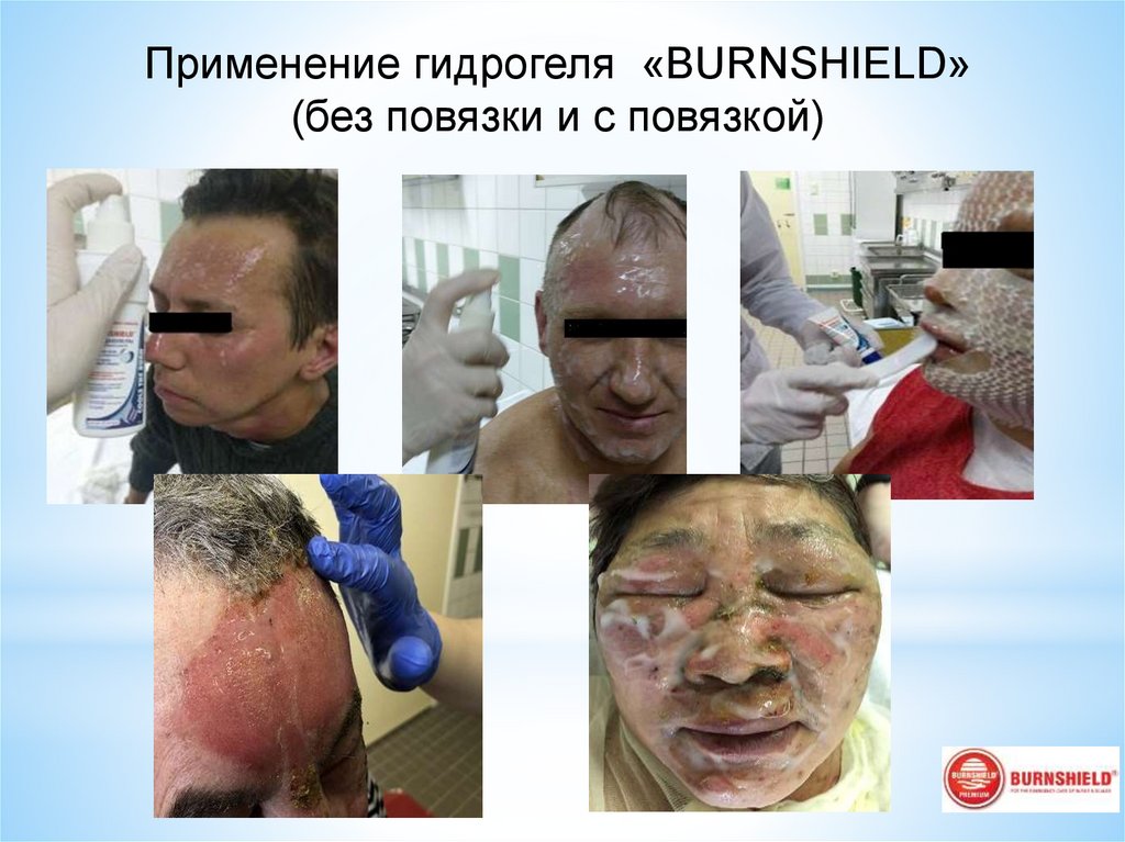 Применение гидрогеля «BURNSHIELD»(без повязки и с повязкой)