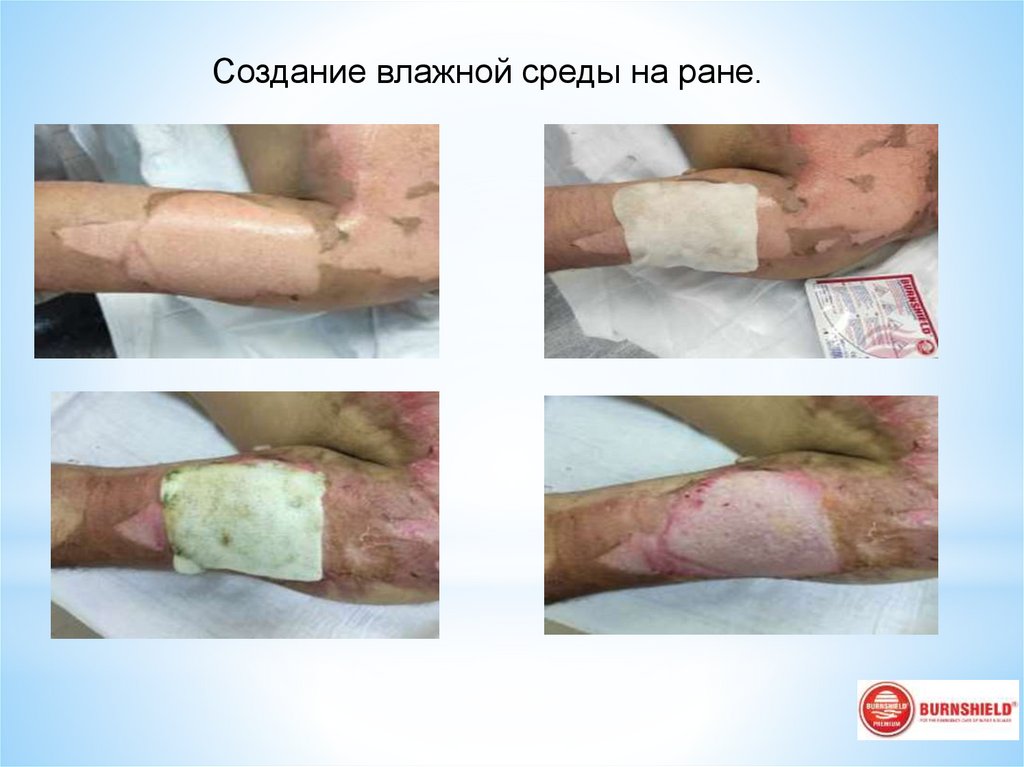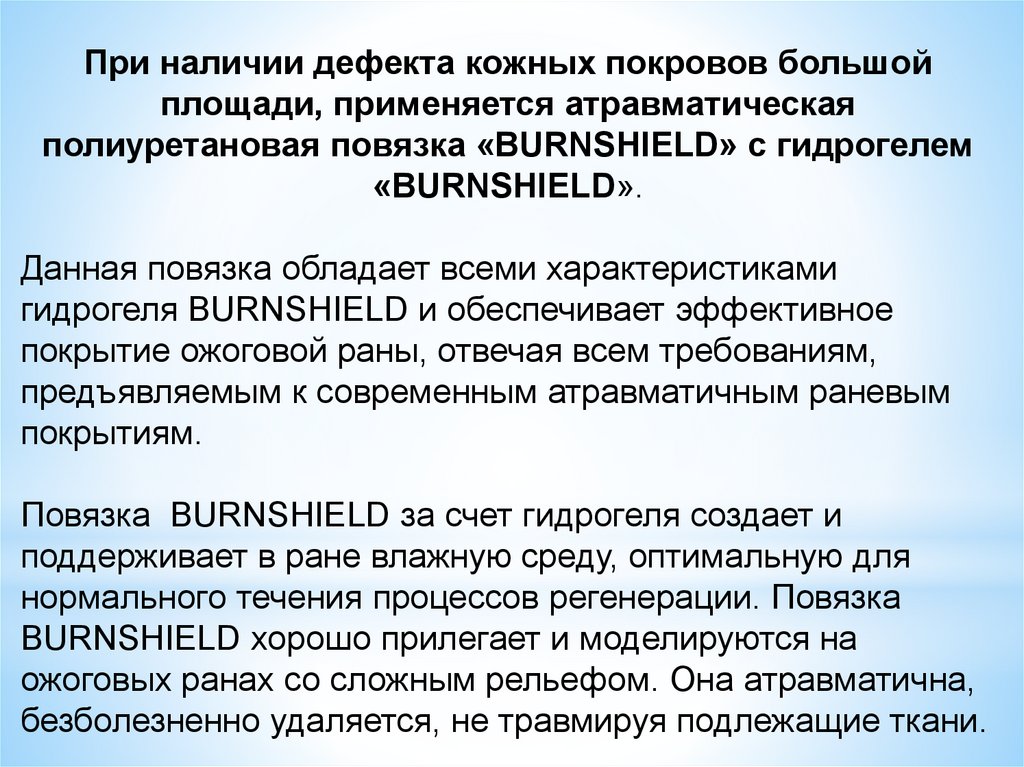 - Благодаря гидрогелю «BURNSHIELD» в ране создается