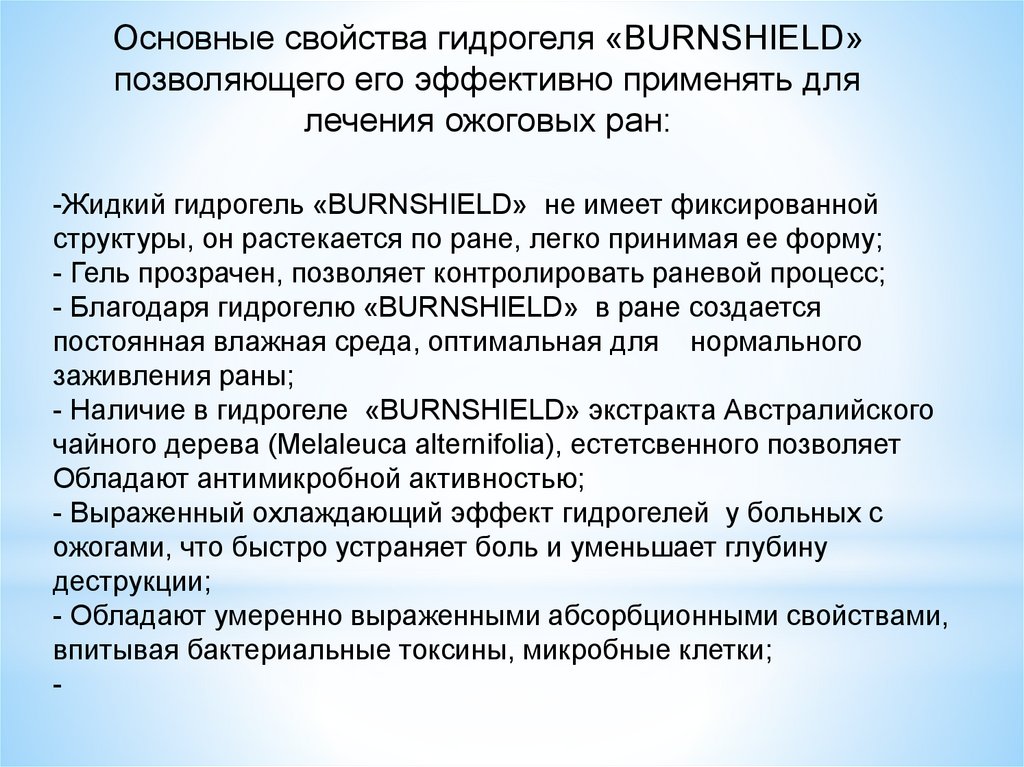 Основные свойства гидрогеля «BURNSHIELD»позволяющего его эффективно применять для
