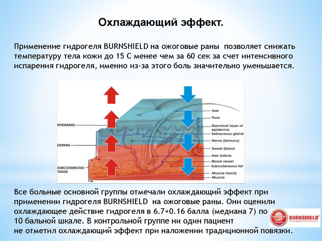 Охлаждающий эффект.Применение гидрогеля BURNSHIELD на ожоговые раны позволяет снижать