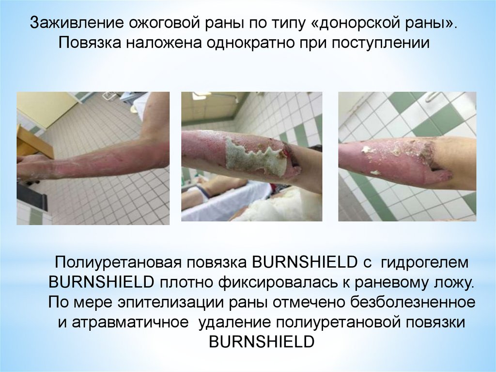 Заживление ожоговой раны по типу «донорской раны».Повязка наложена однократно при поступлении