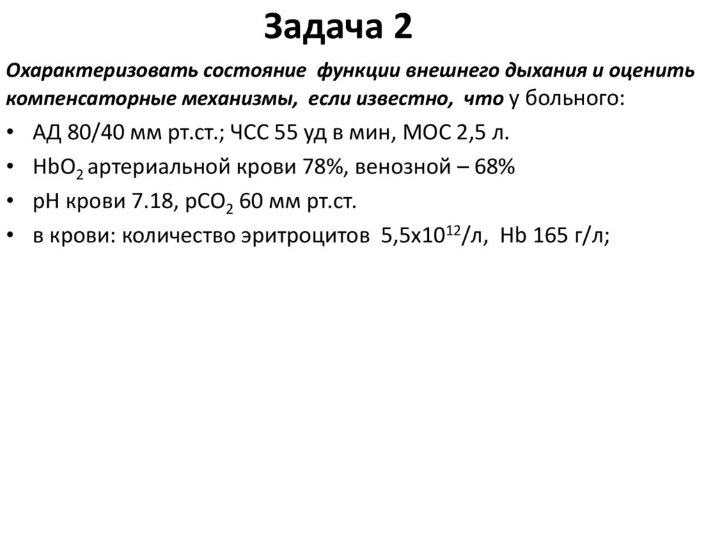 • HbО2 артериальной крови 80%, венозной - 35%; рН крови 7.25,