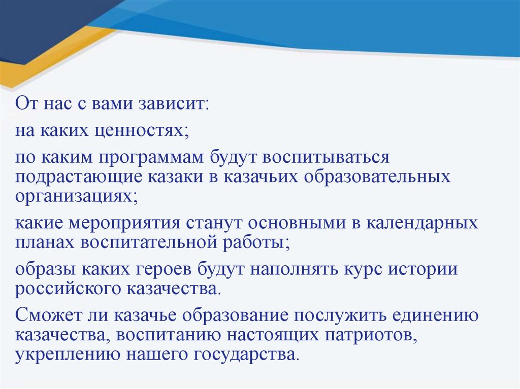 казачества, воспитанию настоящих патриотов,