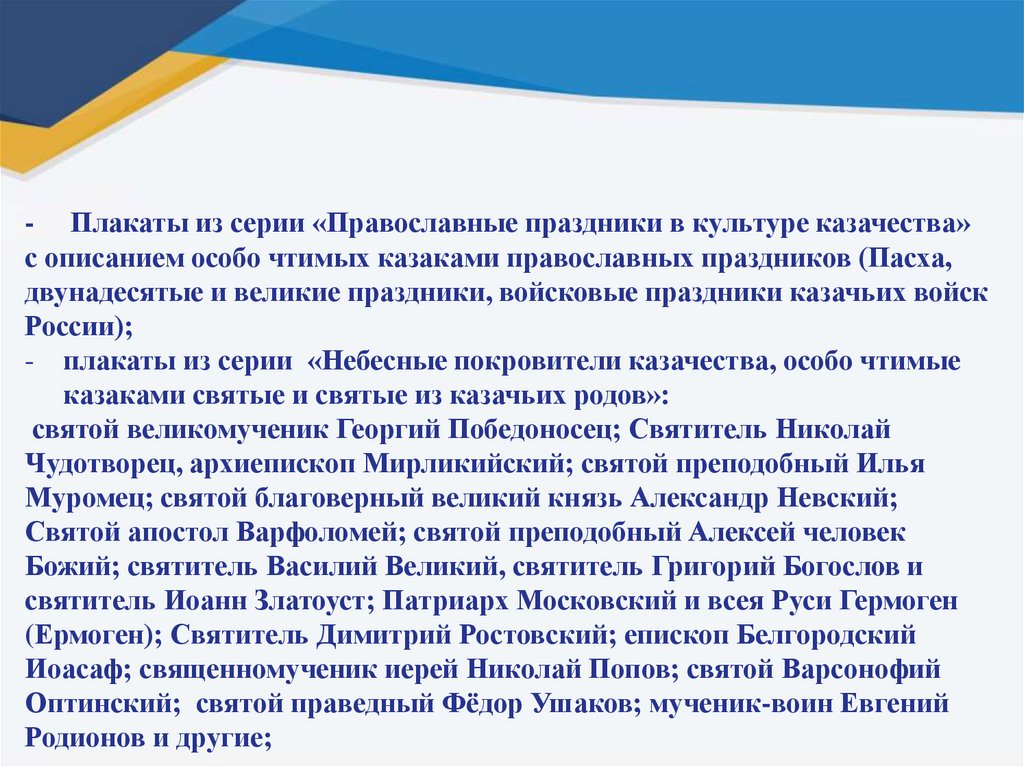- Плакаты из серии «Православные праздники в культуре казачества»с описанием особо чтимых казаками православных праздников (Пасха,