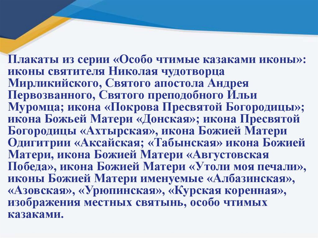 - плакаты из серии «Небесные покровители казачества, особо чтимые