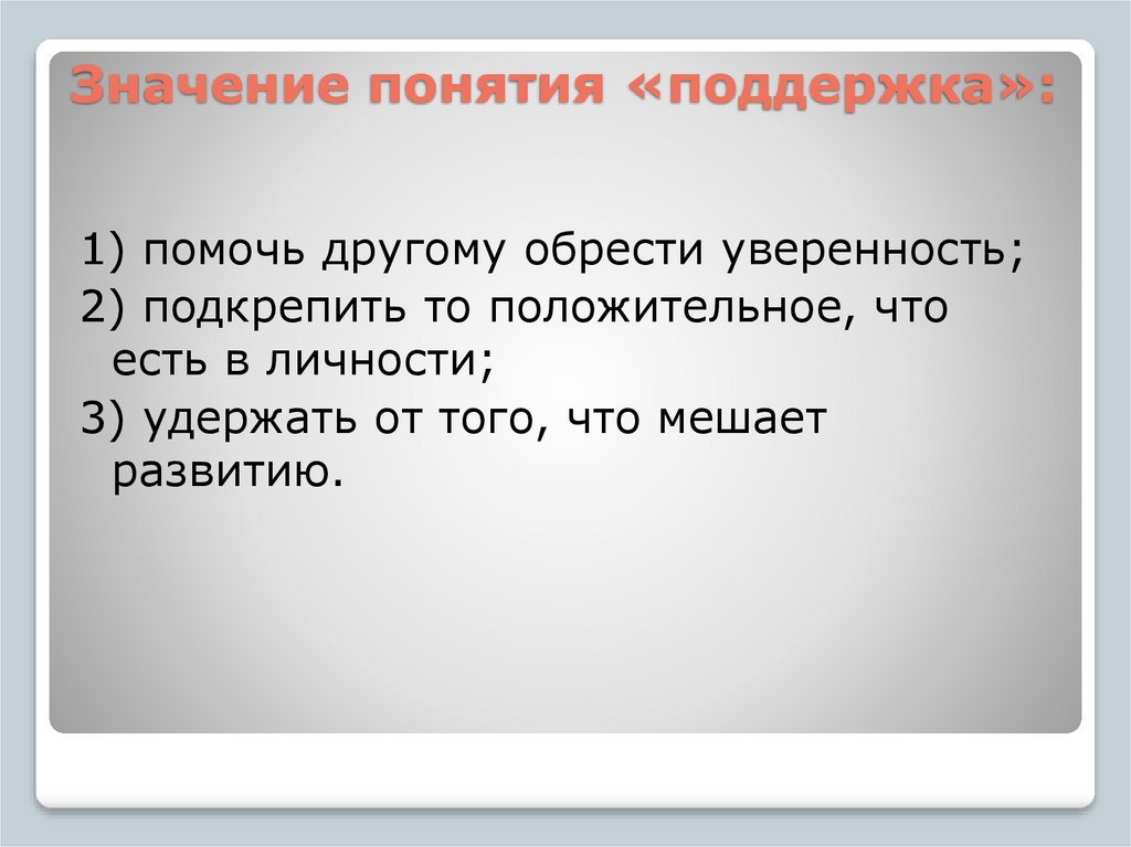 Значение понятия «поддержка»:1) помочь другому обрести уверенность;