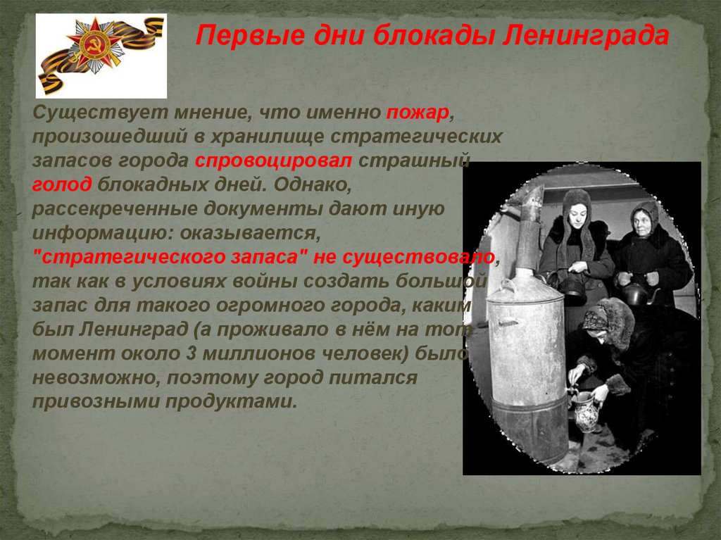 Первые дни блокады ЛенинградаСуществует мнение, что именно пожар,