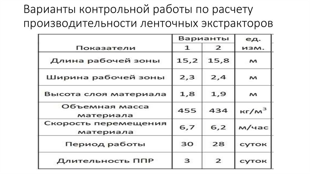 Варианты контрольной работы по расчетупроизводительности ленточных экстракторов