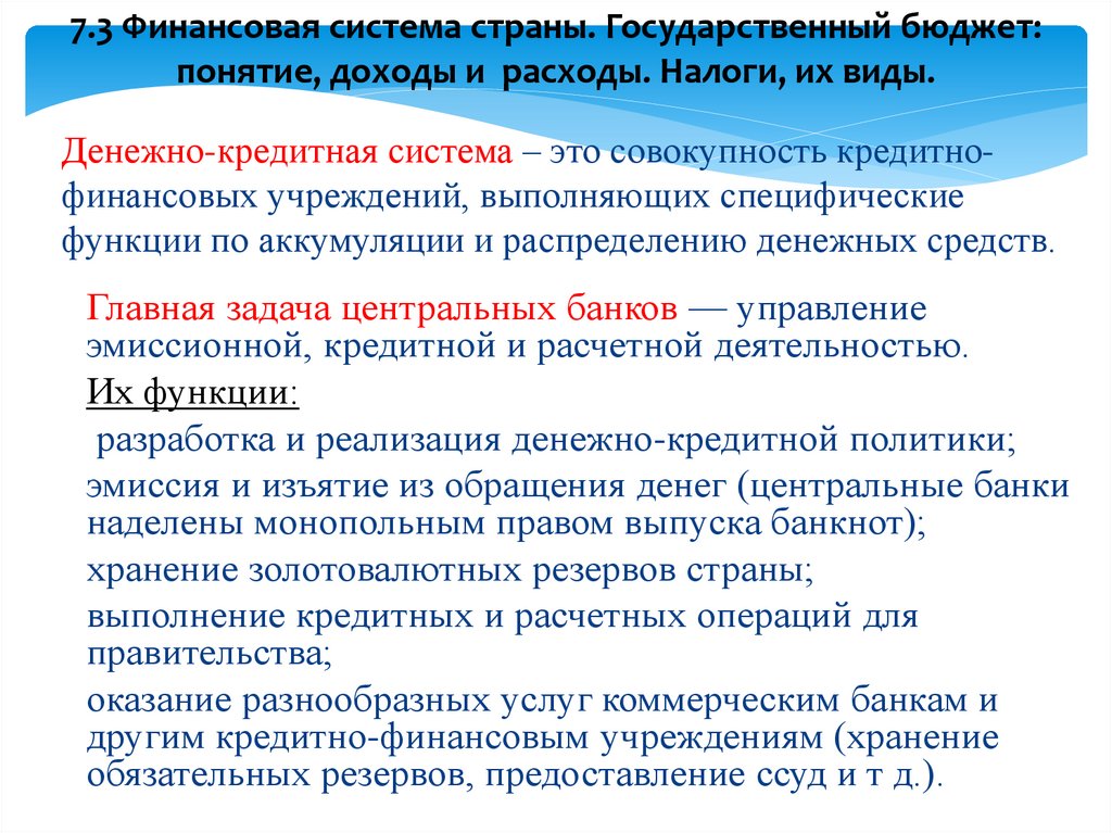 7.3 Финансовая система страны. Государственный бюджет:понятие, доходы и расходы. Налоги, их виды.
