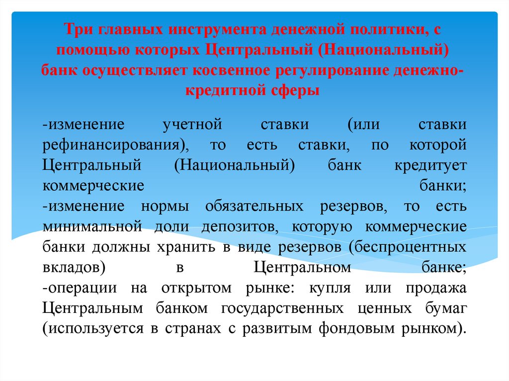 Три главных инструмента денежной политики, спомощью которых Центральный (Национальный)