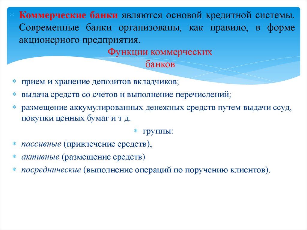 Коммерческие банки являются основой кредитной системы.Современные банки организованы, как правило, в форме
