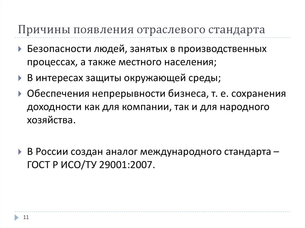 Причины появления отраслевого стандартаБезопасности людей, занятых в производственных