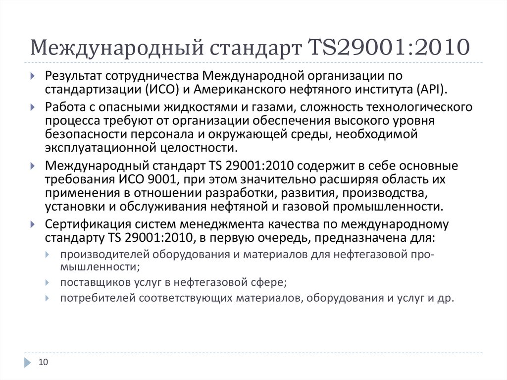 Международный стандарт TS 29001:2010 содержит в себе основные
