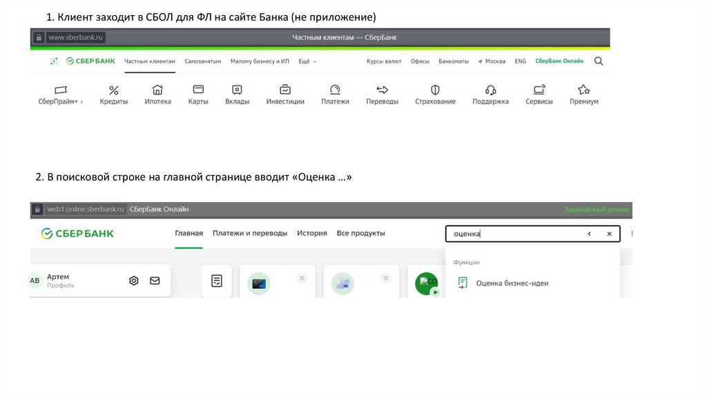 1. Клиент заходит в СБОЛ для ФЛ на сайте Банка (не приложение)2. В поисковой строке на главной странице вводит «Оценка …»