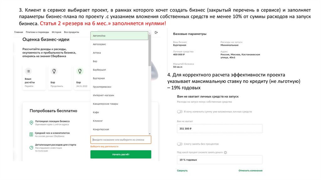 3. Клиент в сервисе выбирает проект, в рамках которого хочет создать бизнес (закрытый перечень в сервисе) и заполняетпараметры бизнес-плана по проекту .с указанием вложения собственных средств не менее 10% от суммы расходов на запуск