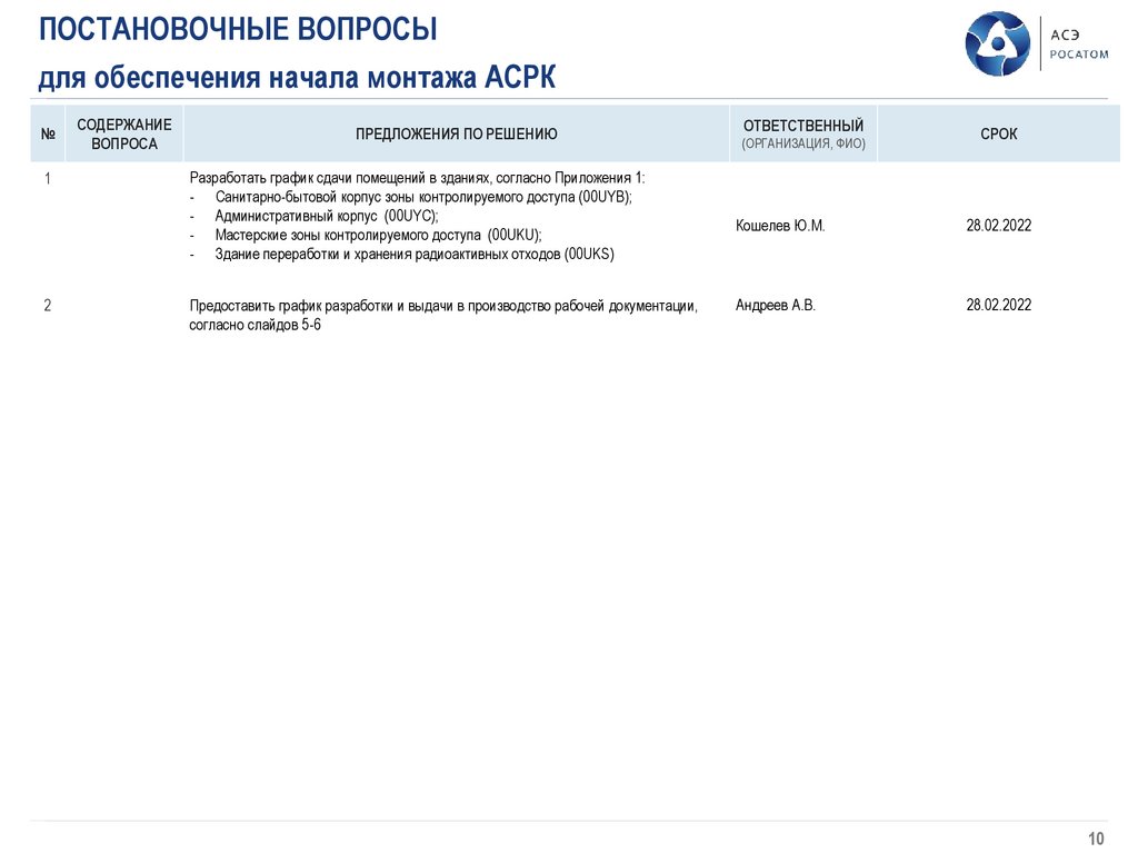 ПОСТАНОВОЧНЫЕ ВОПРОСЫдля обеспечения начала монтажа АСРК