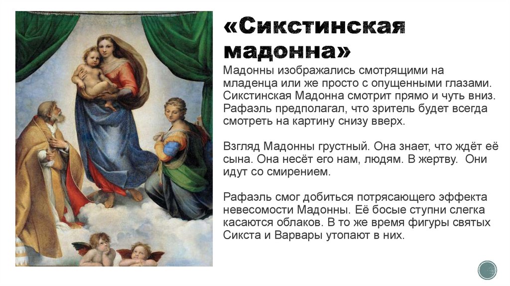 Сикстинская Мадонна смотрит прямо и чуть вниз.