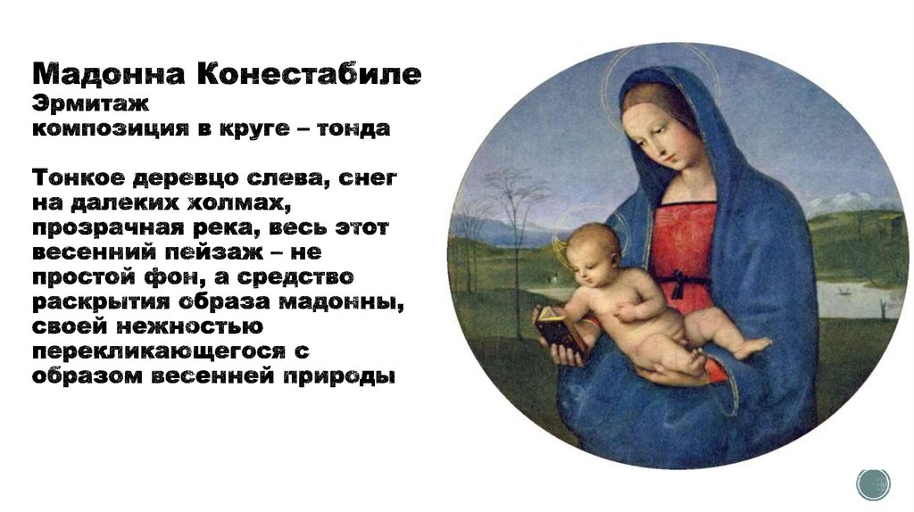 Мадонны изображались смотрящими намладенца или же просто с опущенными глазами.