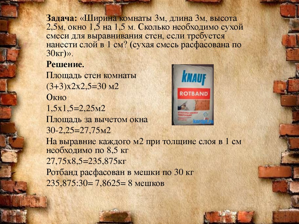 Задача: «Ширина комнаты 3м, длина 3м, высота2,5м, окно 1,5 на 1,5 м. Сколько необходимо сухой