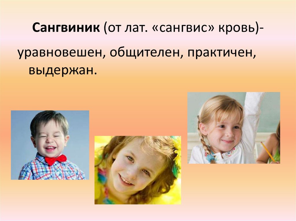 Сангвиник (от лат. «сангвис» кровь)уравновешен, общителен, практичен,выдержан.