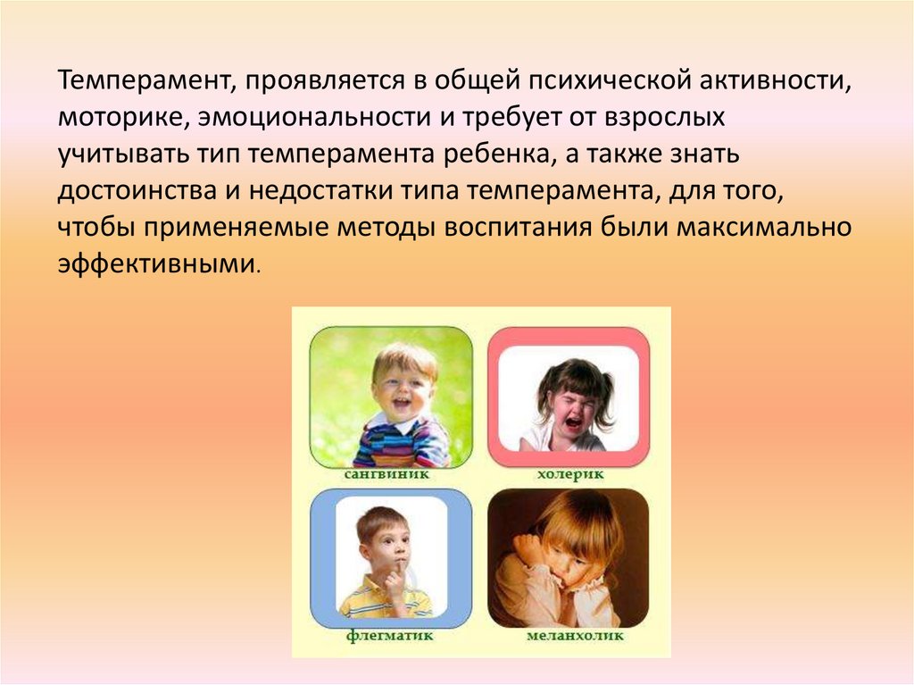 Темперамент, проявляется в общей психической активности,моторике, эмоциональности и требует от взрослых