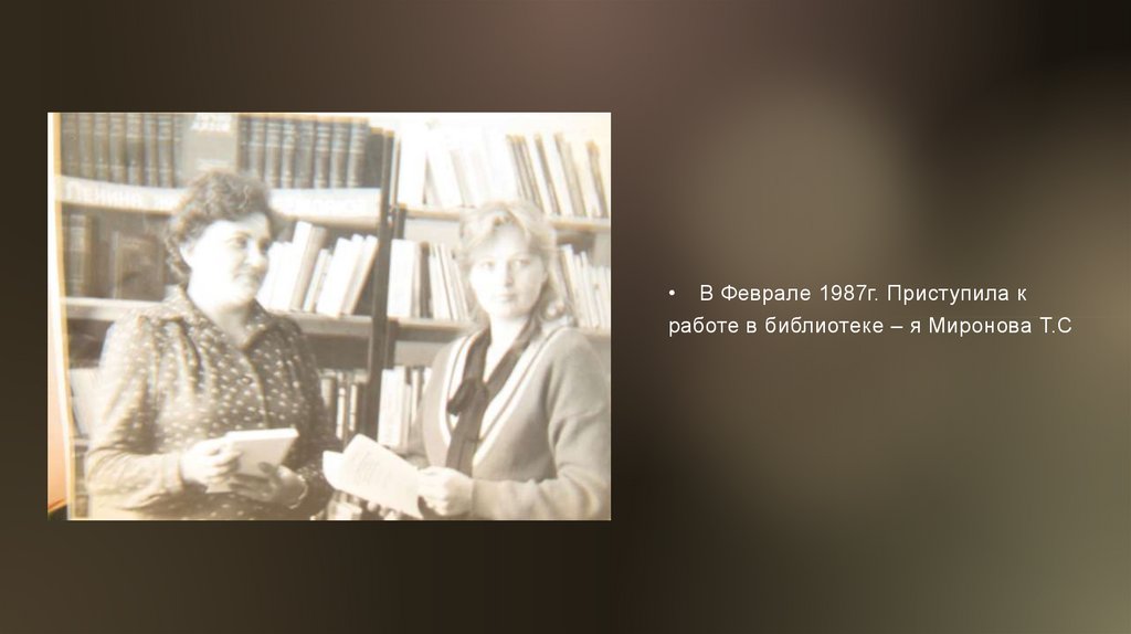 • В Феврале 1987г. Приступила кработе в библиотеке – я Миронова Т.С