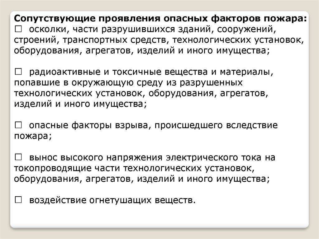 Сопутствующие проявления опасных факторов пожара:осколки, части разрушившихся зданий, сооружений,
