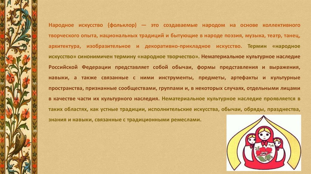 искусство» синонимичен термину «народное творчество». Нематериальное культурное наследие