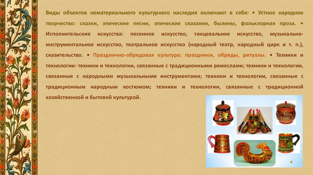 Виды объектов нематериального культурного наследия включают в себя: • Устное народноетворчество: сказки, эпические песни, эпические сказания, былины, фольклорная проза.