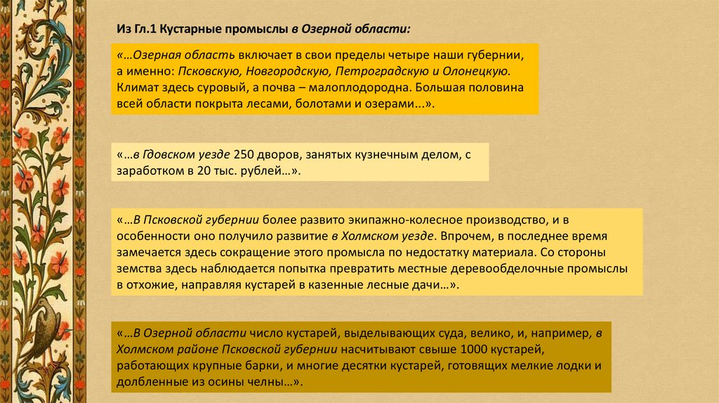 Из Гл.1 Кустарные промыслы в Озерной области:«…Озерная область включает в свои пределы четыре наши губернии,