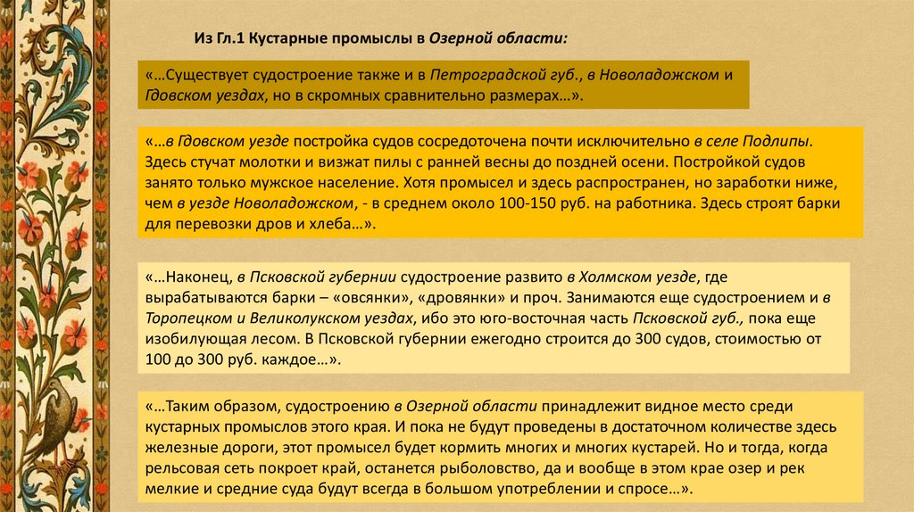 Из Гл.1 Кустарные промыслы в Озерной области:«…Существует судостроение также и в Петроградской губ., в Новоладожском и