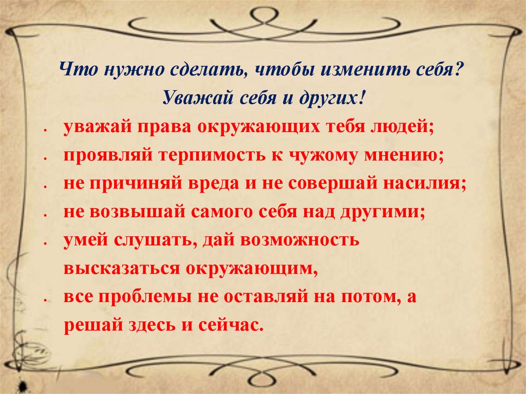 Что нужно сделать, чтобы изменить себя?Уважай себя и других!